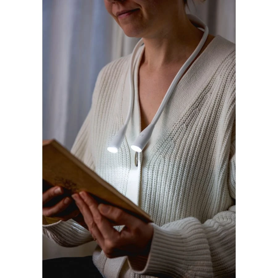 This lightweight lamp is the perfect product for anyone who enjoys reading or crafting. Wrap the lamp around your neck to direct the light on your lap. The product leaves your hands free, thus letting you focus on what you are doing. Produces powerful light from both ends. You can choose the lighting level from three different settings. Recharges via USB, charging cable included in the box. The products are delivered in a convenient countertop stand featuring 5 pcs. for easy in-store displays. The individual product packages can also be hung on hooks.