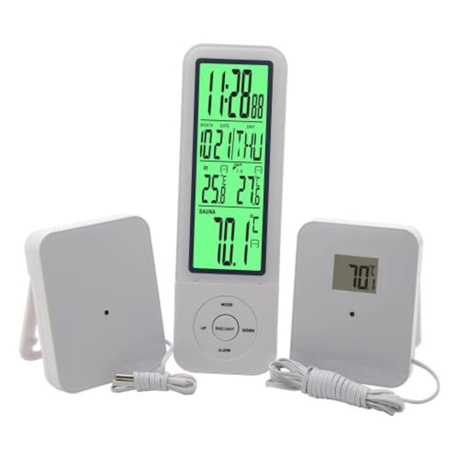 - Contains two transmitters (one for outside and one for e.g. sauna.)