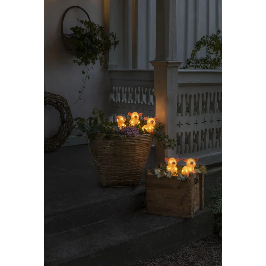 Light series acrylic pigs, 5 pcs/set. A total of 5×8 warm white LEDs. The height of the pig is 12.5/10 cm, the width is 10.5/12.5 cm and the depth is 6.5/10 cm. The total length of the light set is 900 cm, of which the connecting cable is 500 cm. The color of the wire is white. The characters are 100 cm apart. Transformer 24 V. For outdoor use, IP44.
