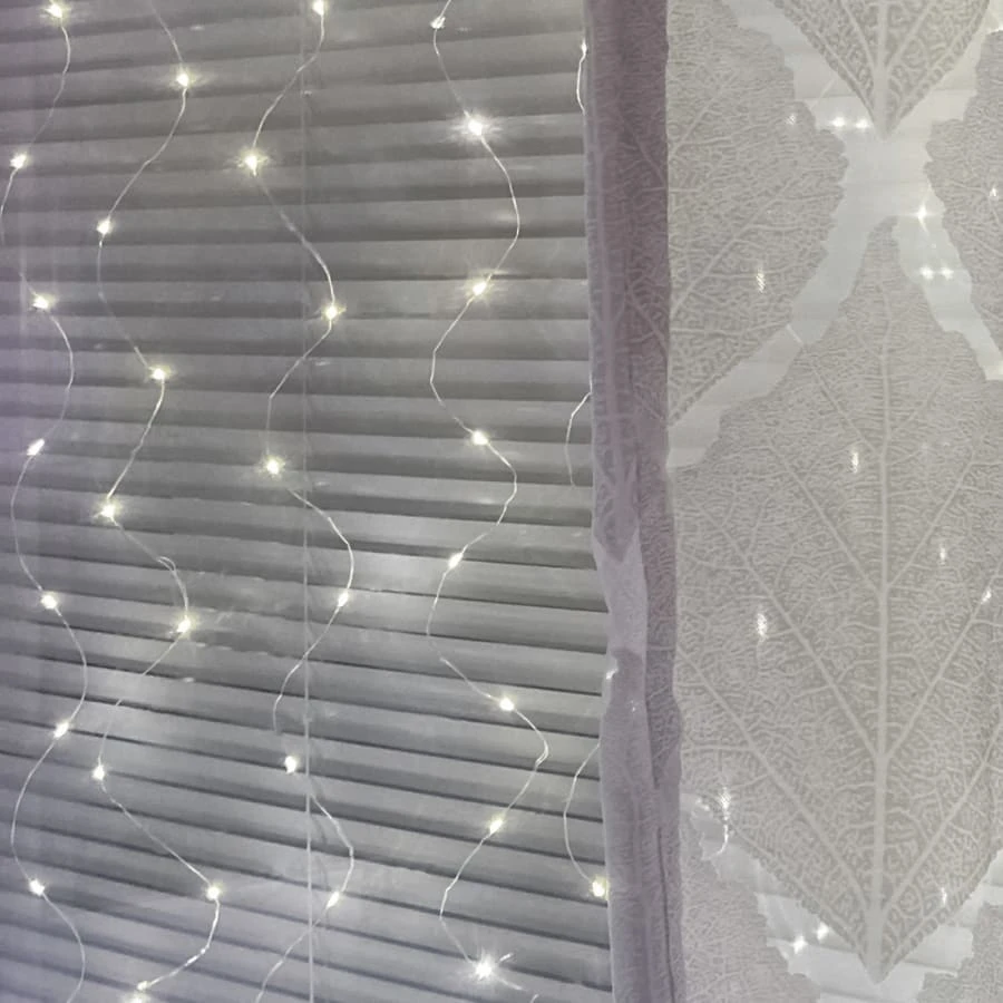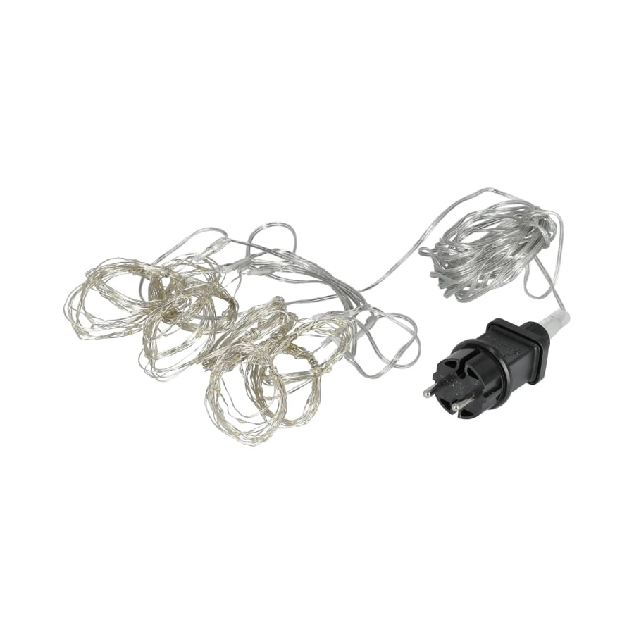 Beautiful and attractive light curtain with 200 warm white led lights. The width of the light curtain is 90 cm and the height is 200 cm. The light curtain has a clear 5 meter long starter cable. The strands of the light curtain are bendable silver-colored copper wire.
