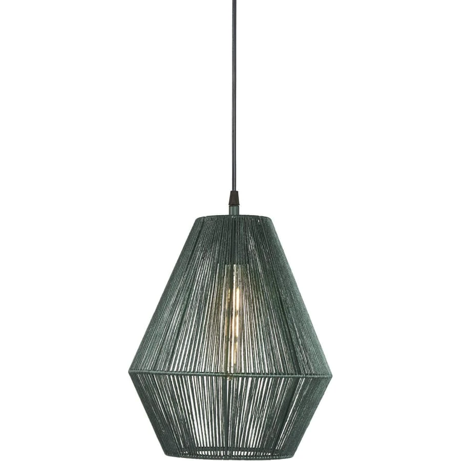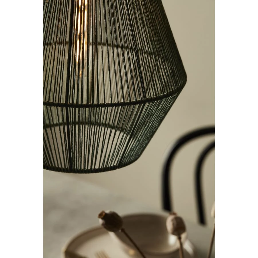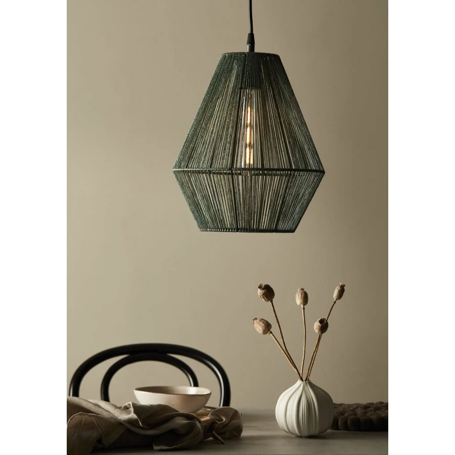 En modern hänglampa med vacker geometrisk form som passar perfekt in i den skandinaviska inredningsstilen. Tråd är handflätat runt lampans metallram. Ljuset lyser vackert genom trådarna.