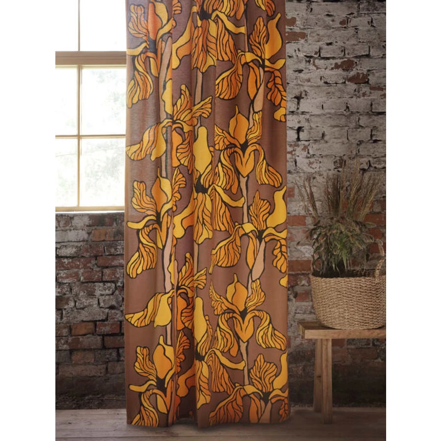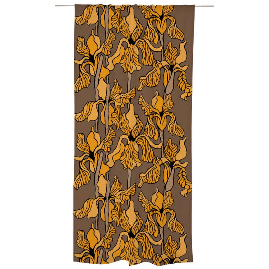 Kurjenmiekka-kuosin lähtökohtana on toiminut puutarhan kurjenmiekkojen graafiset muodot, jotka rykelmänä sekoittuvat ja muodostavat pinnan. Yksittäispakattu valmisverho, rypytysnauha ja tankokuja yläreunassa.